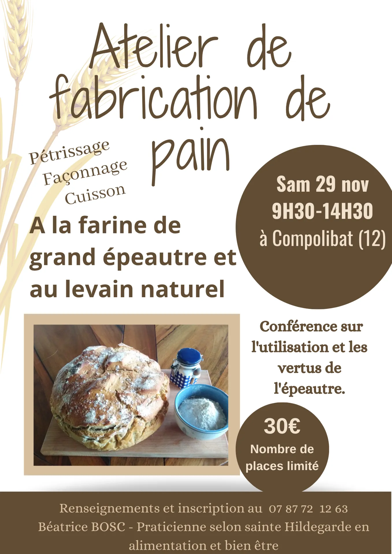 Atelier de fabrication avec Béatrice BOSC de pain, pétrissage, façonnage et cuisson ; à la farine épeautre et au levain naturel. Conférence sur l’utilisation et les vertus de l’épeautre. 30 euros, nombre de places limitées. Renseignements et inscriptions 07 87 72 12 63.